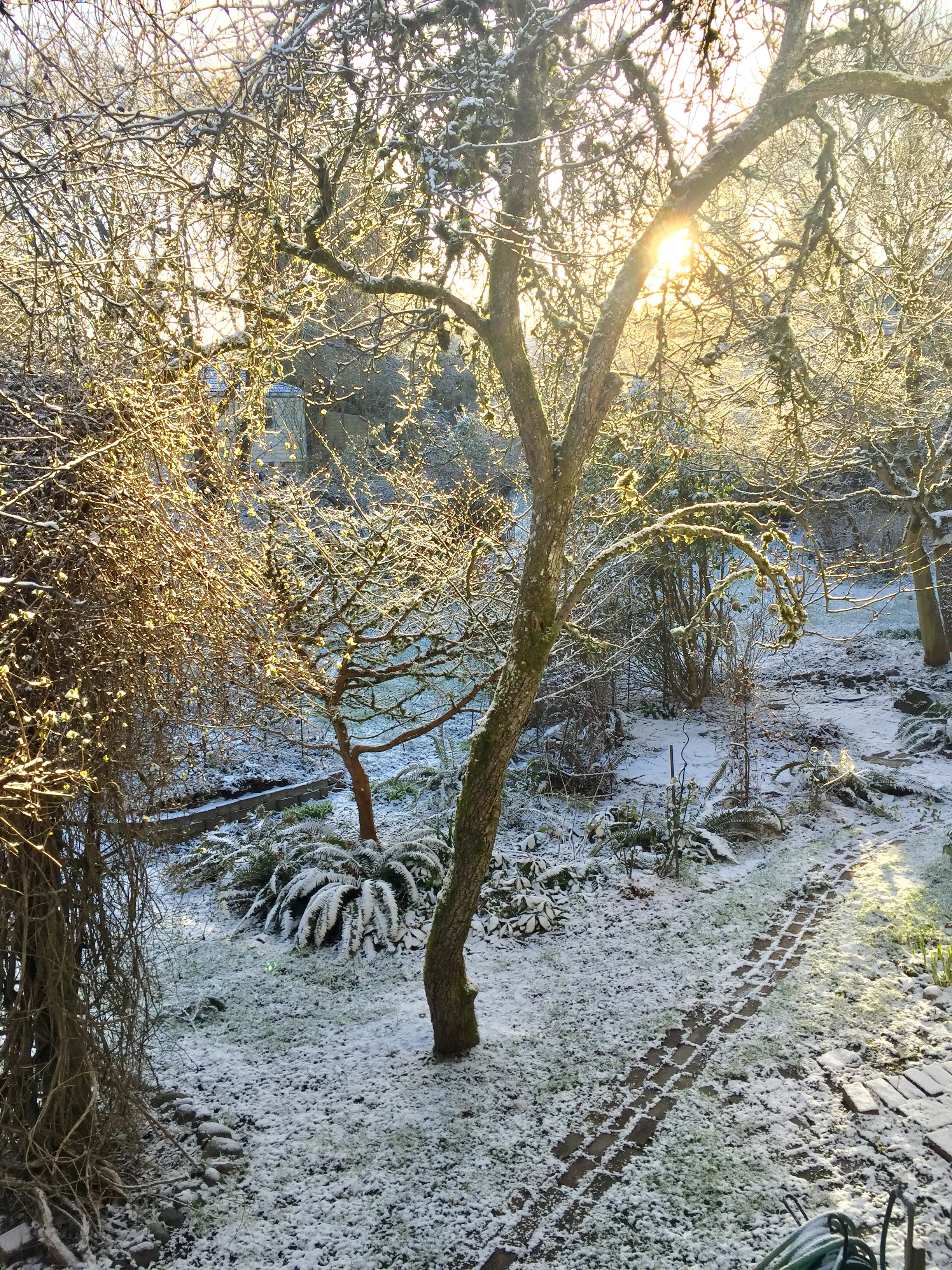 I am frantically packing for an upcoming teaching trip, shipping out boxes of books and art orders, while battling the first stages of a head cold… and feeling a bit overwhelmed and sorry for myself. However awakening to a shimmering world, I am taking in the soft silence and branches glazed with frosting, celebrating light and shadow and how the rising sun turns white to gold.