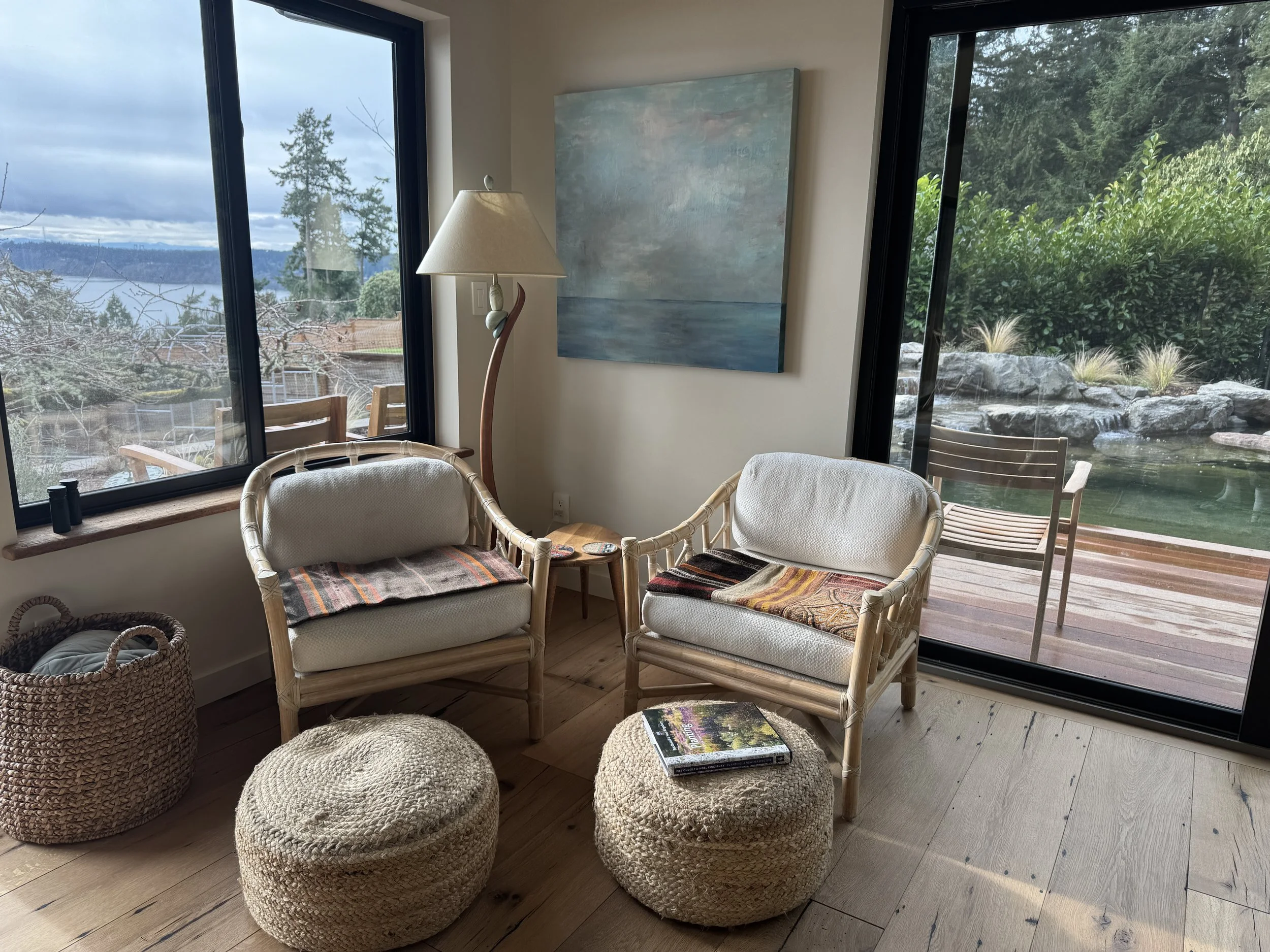 We shook things up a bit by placing the lower wall of windows on the side with commanding views of Puget Sound and Mount Rainier (all of the other windows in our house face this way) and the tall windows facing our gardens and forest behind the house.