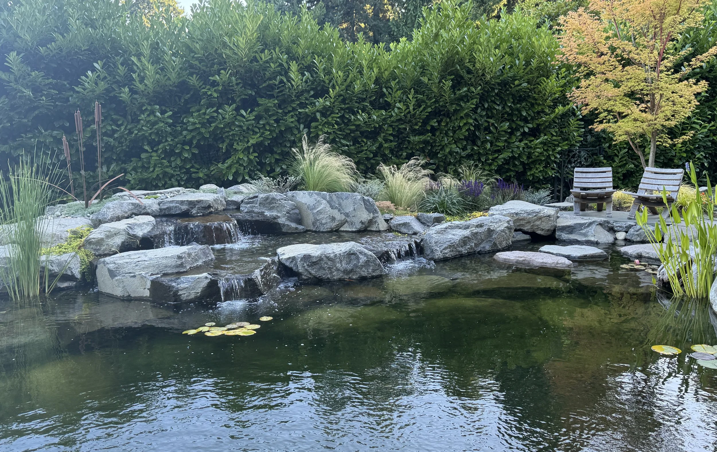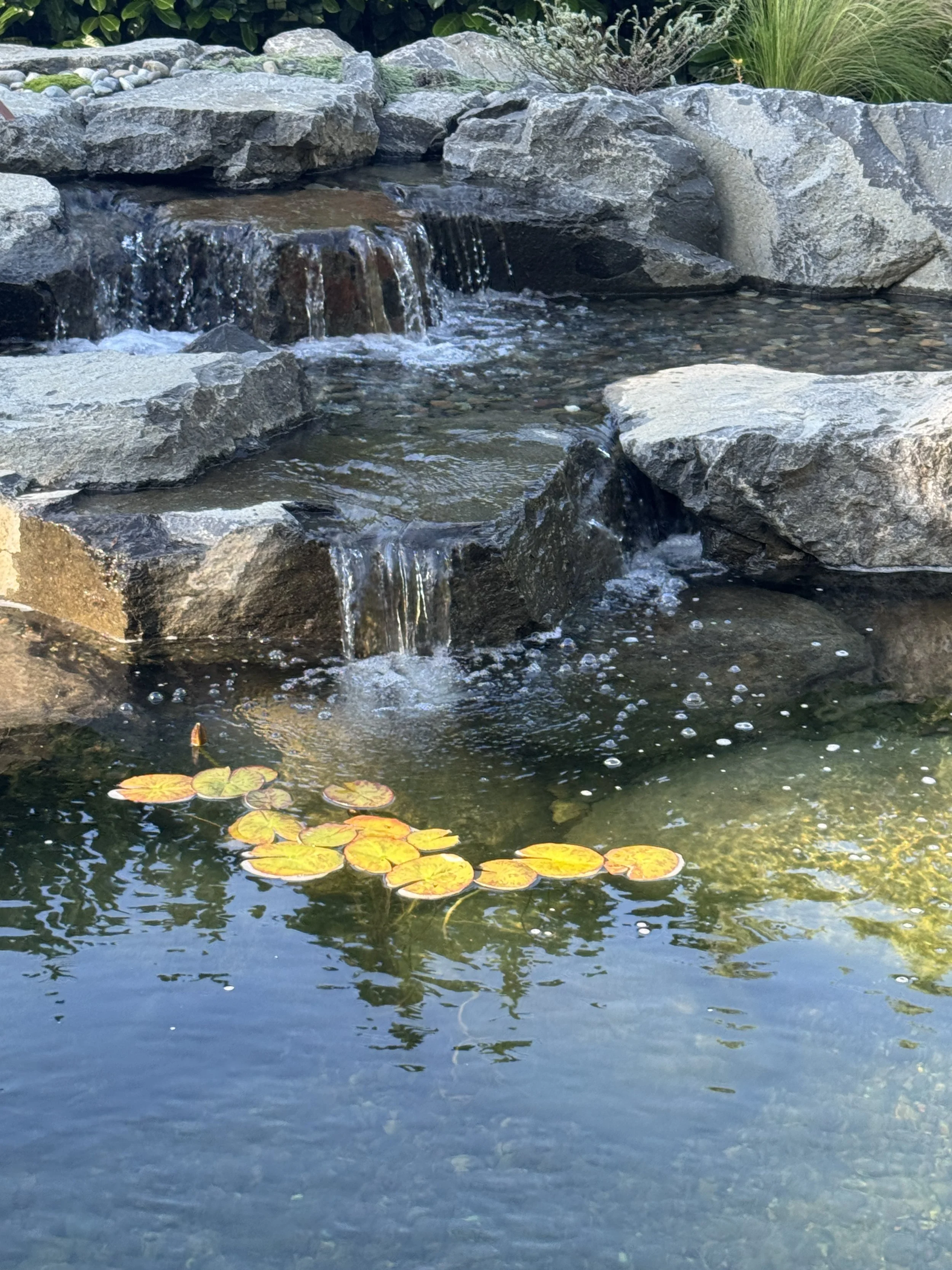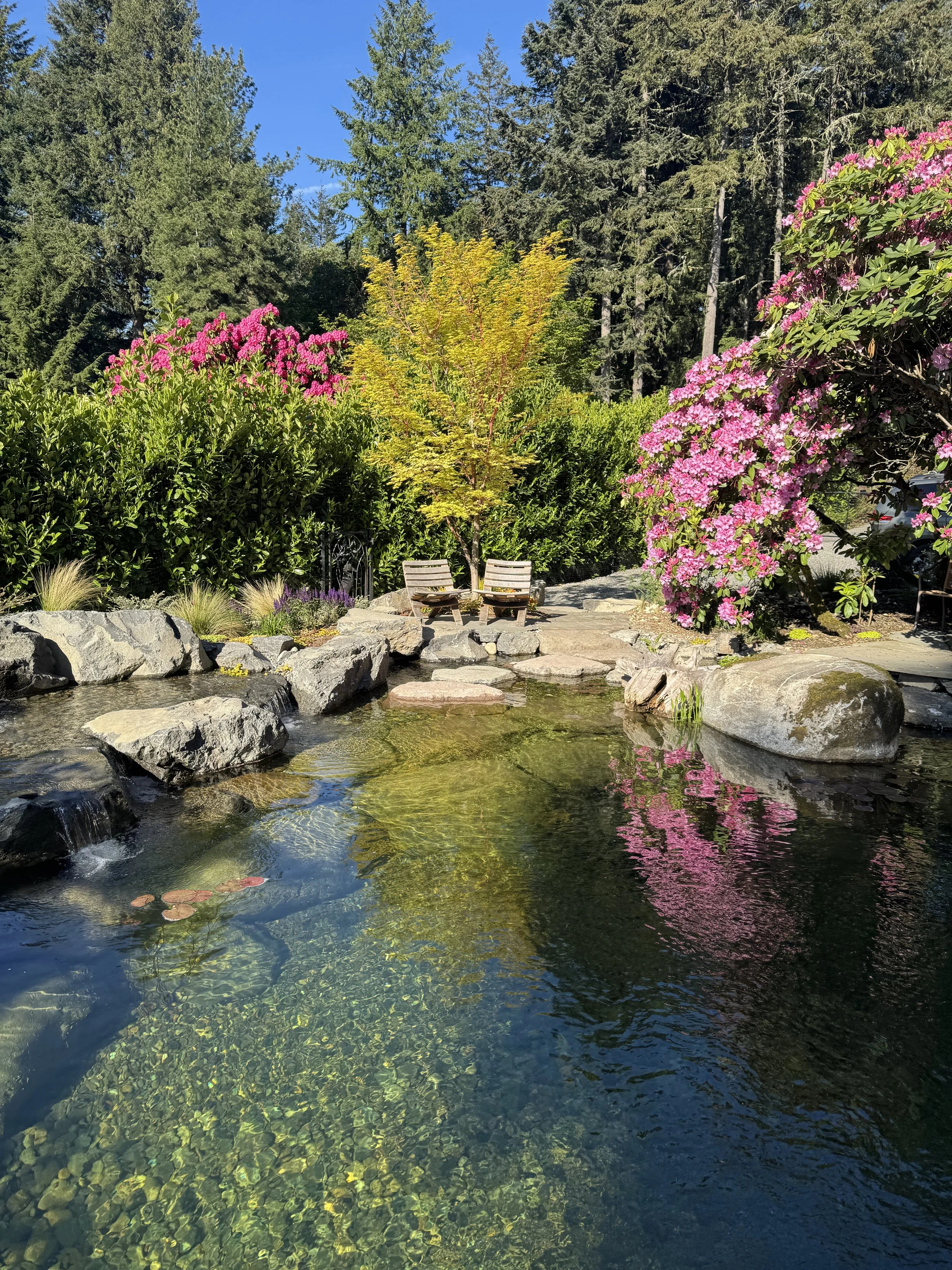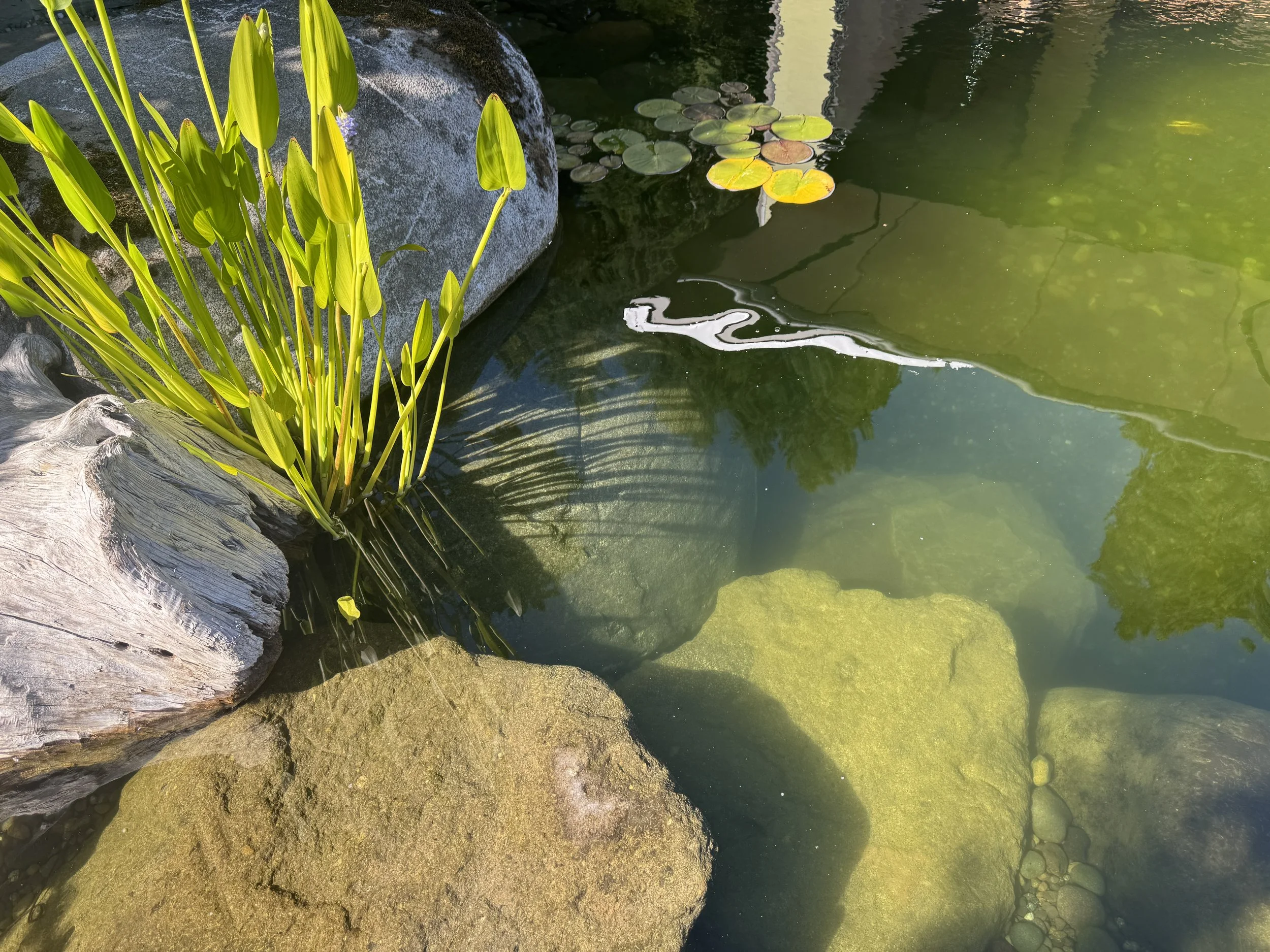 There isn’t a day that goes by that I’m not in and around our pond. Whether I’m hopping from rock to rock gathering debris and checking on my little koi, dangling my feet after a long day, or swimming around with a wine glass perched on the deck, I’m loving the sight, sound and feel.