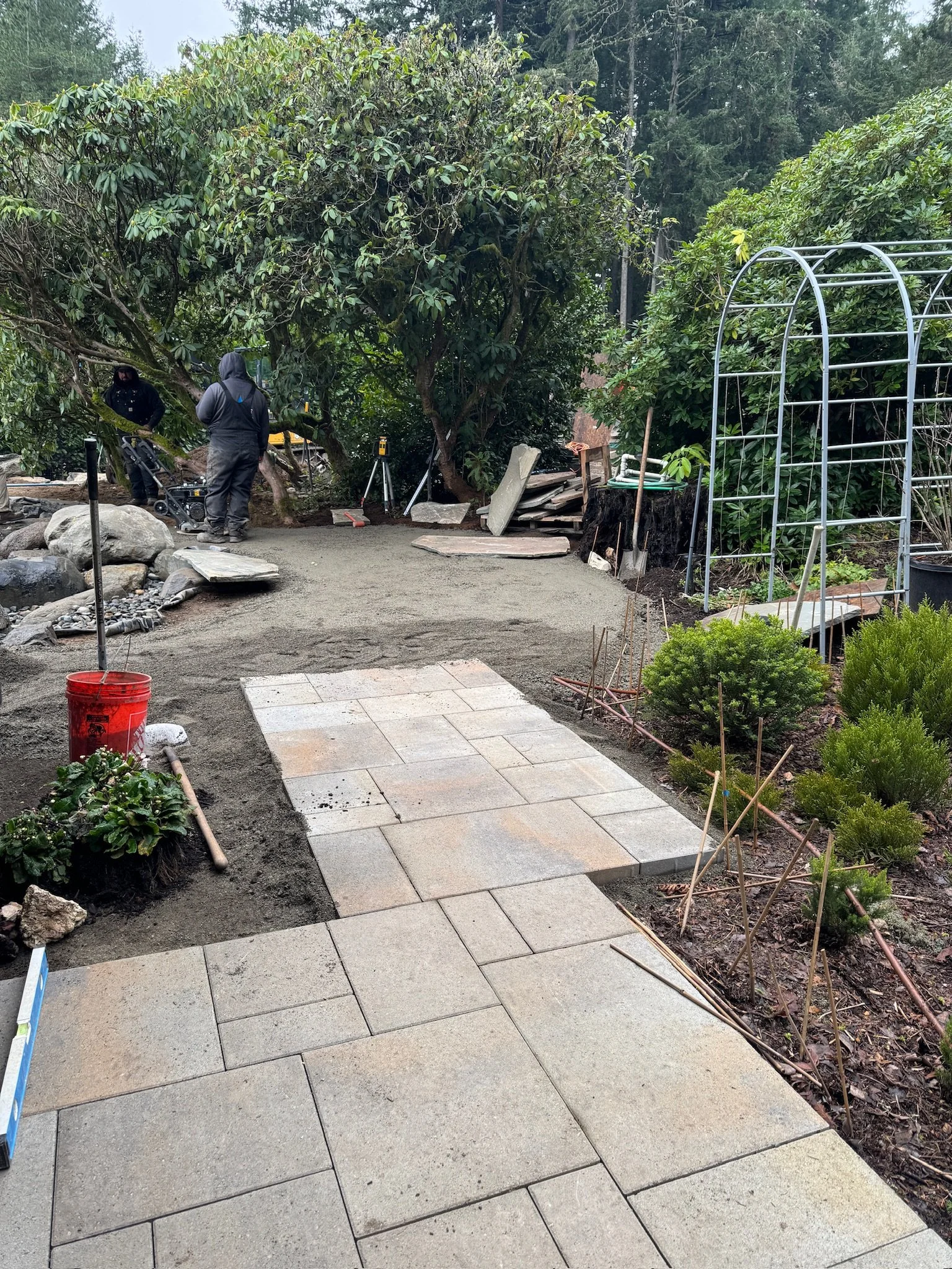 The morning after and the silt is settling in the pond, all of the pavers are in place, and I’ve tucked in some grasses to help soften the edge between pond and rock.