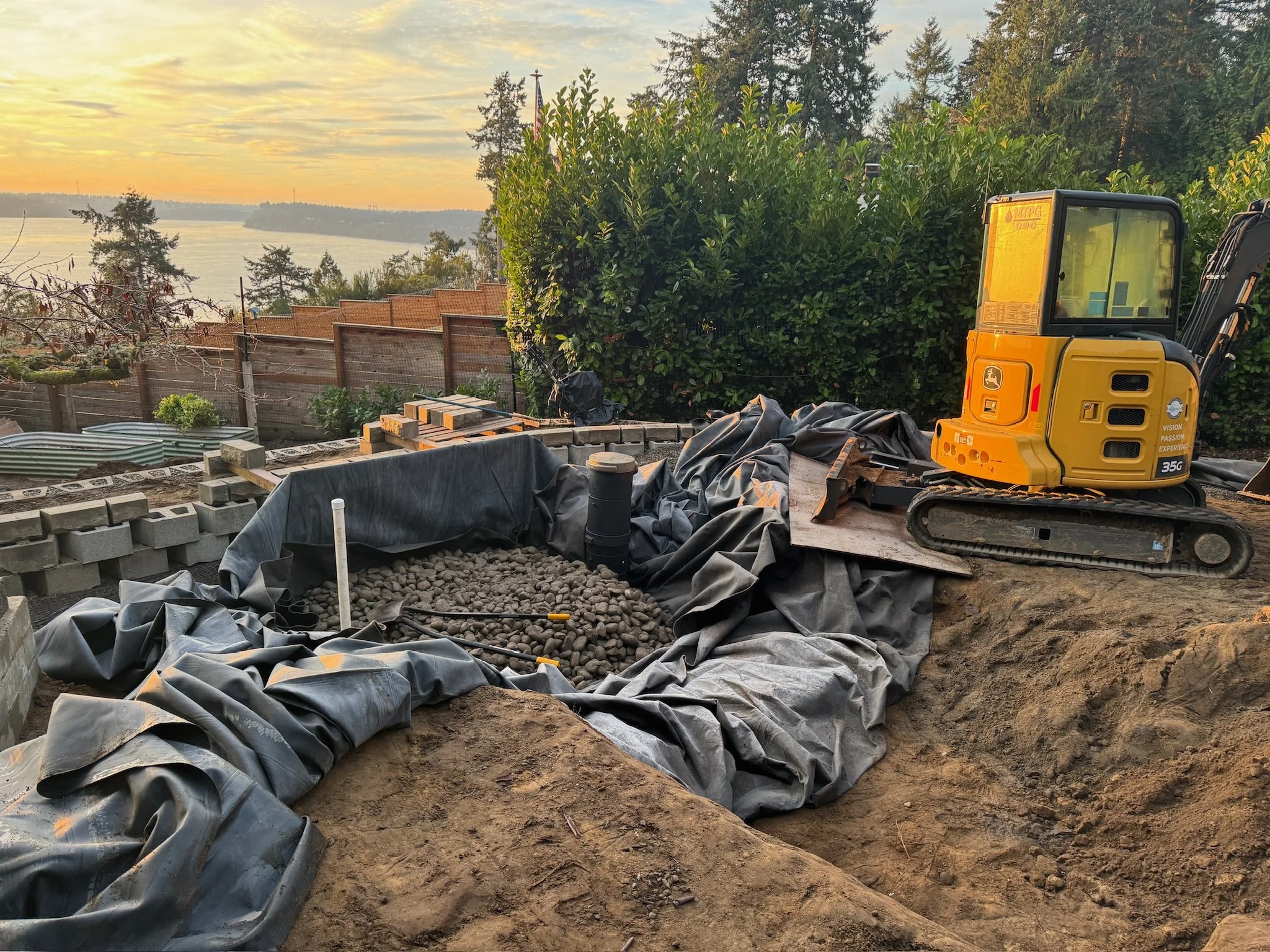 Before he started, Dan zeroed in on a large boulder on-site that was my special rock as a kid. When I told Dan it was my special place to daydream, he decided it needed to be a focal point in the pond. Also, since it’s a glacial rock (as opposed to river rock normally used in ponds), he would pick and chose other glacial rocks to anchor in a more natural feel. Oh and that stump dragged up from the beach – absolutely that’s going into the pond!