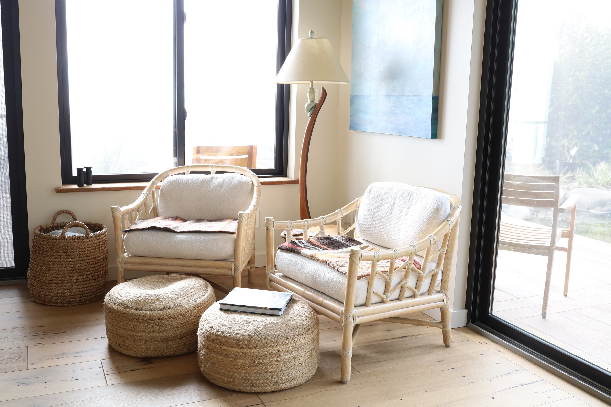This is a corner of my new studio—a perfect neutral backdrop to showcase my vibrant paintings as they pass from my easel to my customers. My dear friend, who comes to stay with me for a month each year, just happens to be a master stylist who helped me pull together cozy vignettes full of natural reused and reclaimed materials, soft textures and layers of off-white, beige and soft brown.